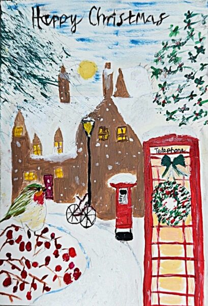 🥈 2nd Place: Sameer, Manor High School, Year 7 Sameer’s design stood out for its detail, texture and thoughtful use of mixed art materials. The accurate perspective and nostalgic imagery evoked warm feelings of Christmases past. The judges were particularly impressed by the craftsmanship and depth in the piece.