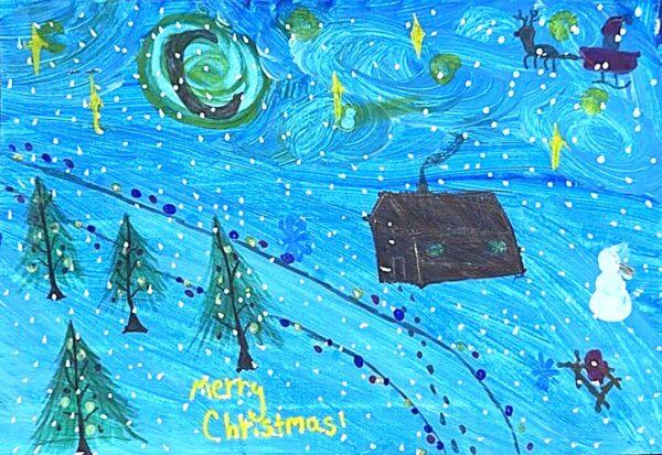 🥉 3rd Place: Haris, Woodland Grange Primary School, Year 6 Haris impressed the judges with excellent use of texture, especially the striking swirly sky. The technique of colour drenching beautifully conveyed the intensity of a wintry blizzard, creating a vivid and atmospheric festive scene.